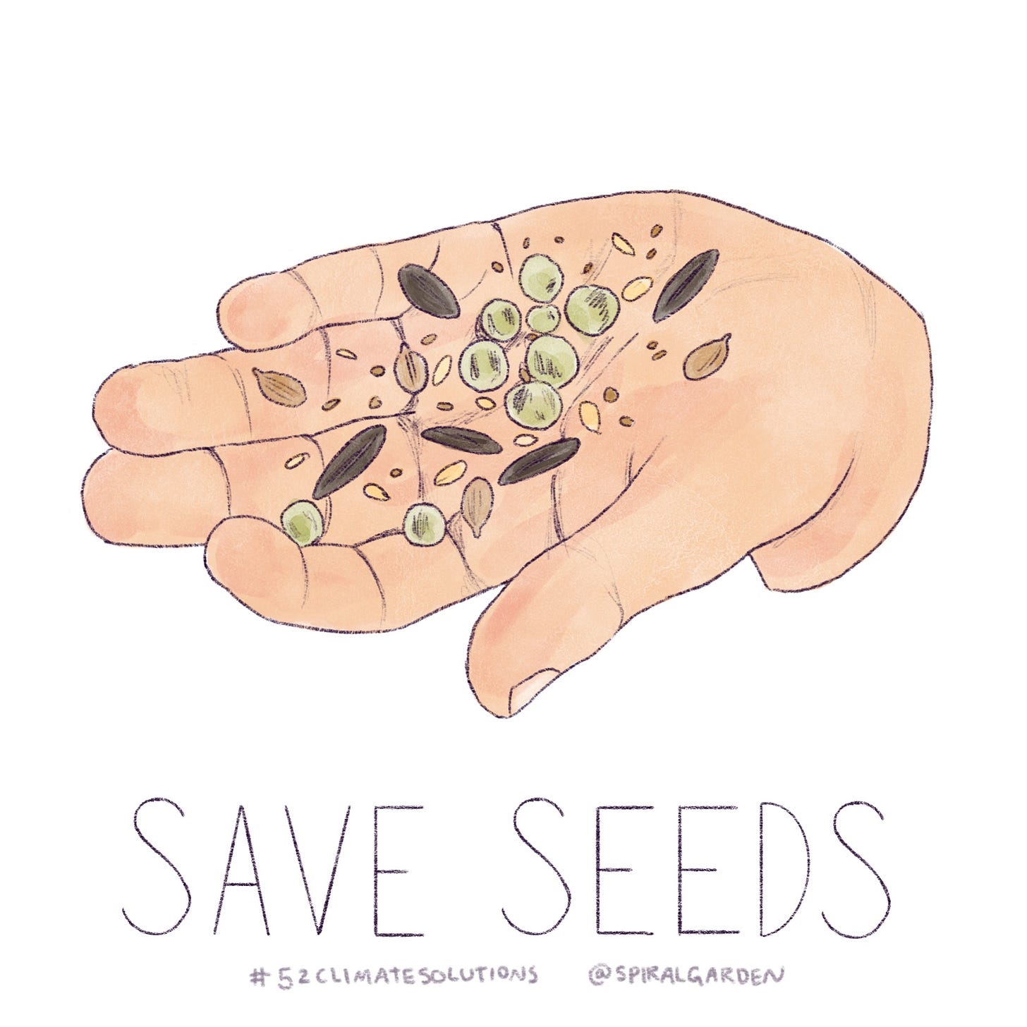 Read on for tips on saving, storing and sharing seeds, as well as resources for learning more and making your own seed packets. You’ll also find this week’d printable colouring page, just for fun or for your climate solutions journal. You can also purchase an art print or tea towel featuring the first 52 climate solutions, here. Let us know how you go by tagging us @spiralgarden on social media, or commenting below.